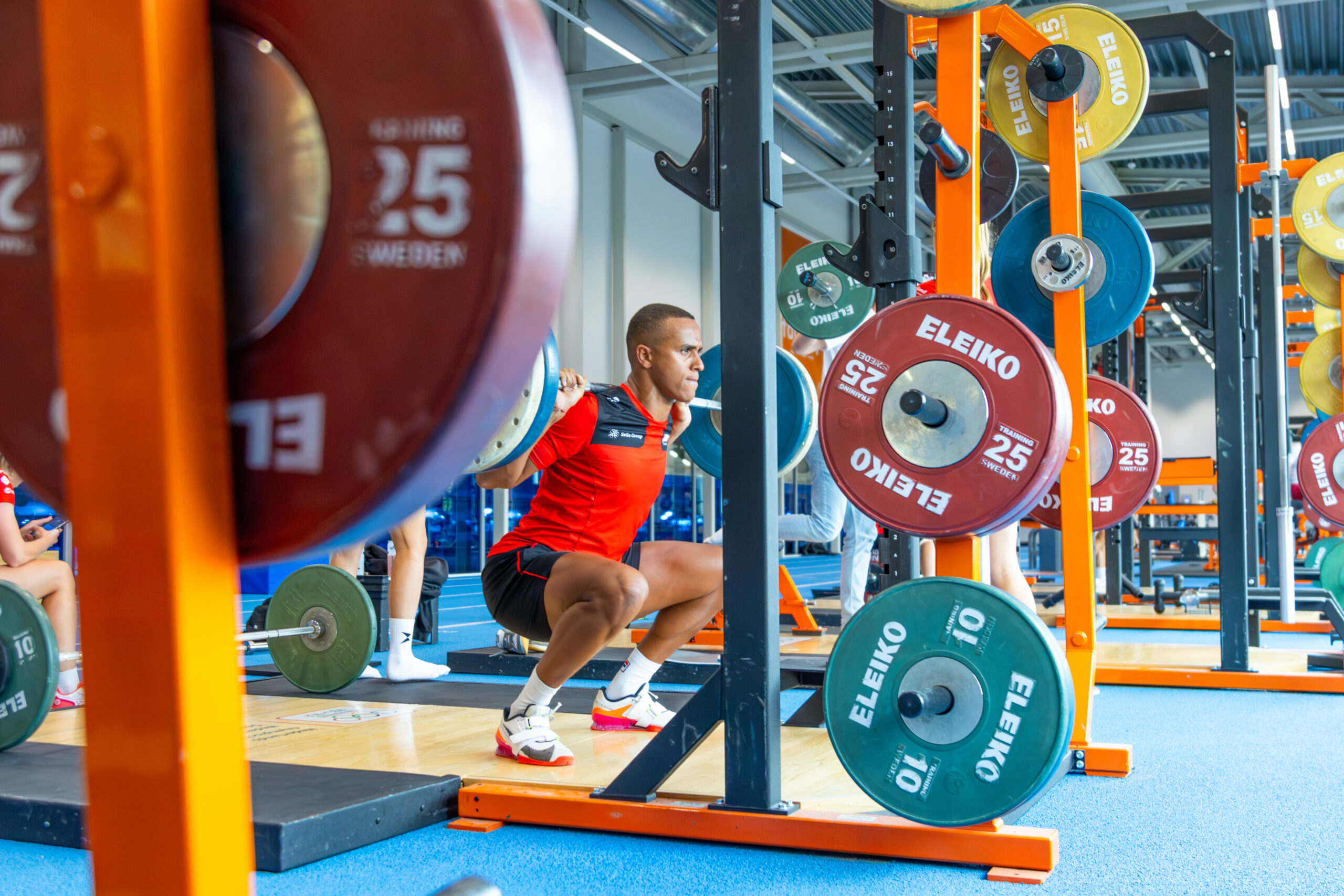 Plaats de halter stabiel op je bovenrug, net onder de nek. Zet je voeten iets breder dan heupbreedte en span je romp aan. Zak gecontroleerd door heupen en knieën, waarbij je het gewicht gelijkmatig over je voeten verdeelt. Ga zo diep als je mobiliteit en controle toelaten en kom vervolgens krachtig maar gecontroleerd omhoog door je heupen te strekken en je bilspieren te activeren.