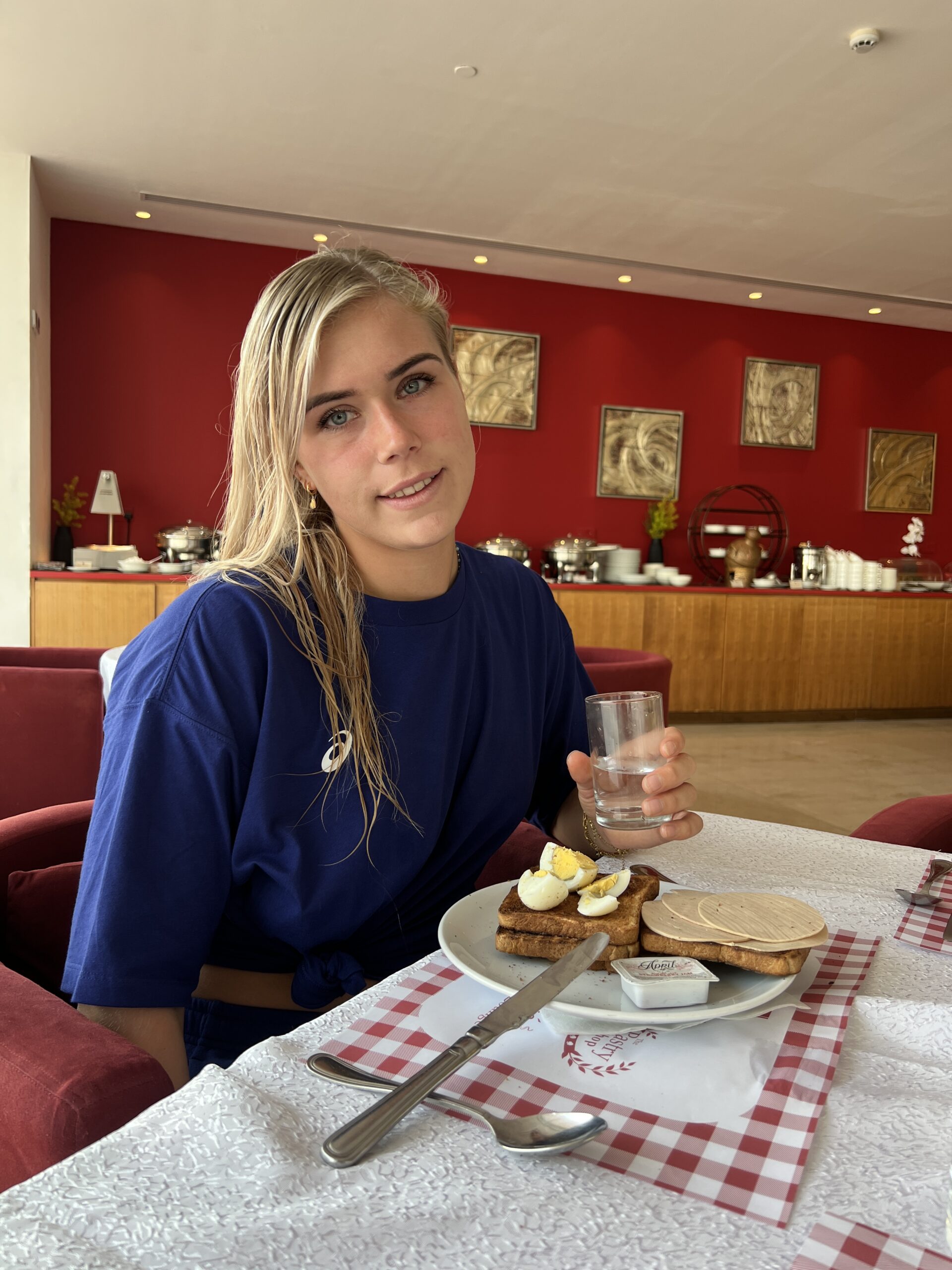 We ontbijten met een lekker buffet, waar ik kip, ei, brood en fruit kies.