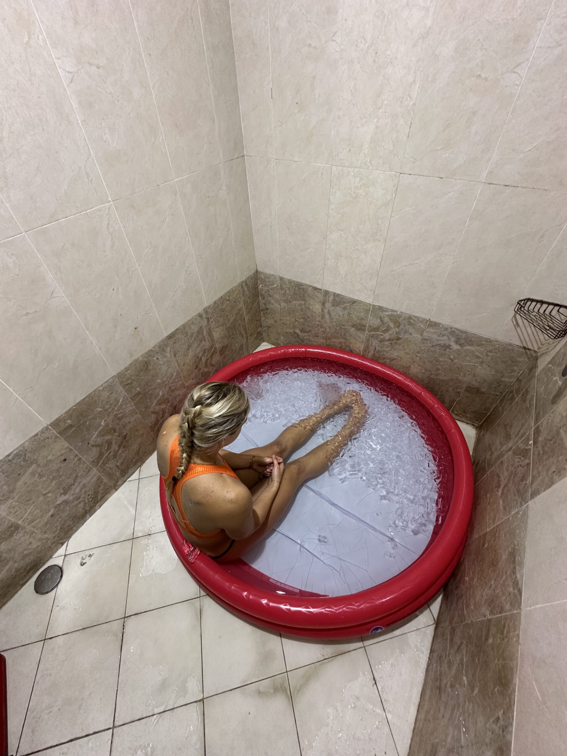 Het ijsbad in, want ik wil goed herstellen voordat we morgen het vliegtuig instappen. In de middag heb ik vrij, drink ik koffie met mijn coach en blikken we vast vooruit op de dagen in India.