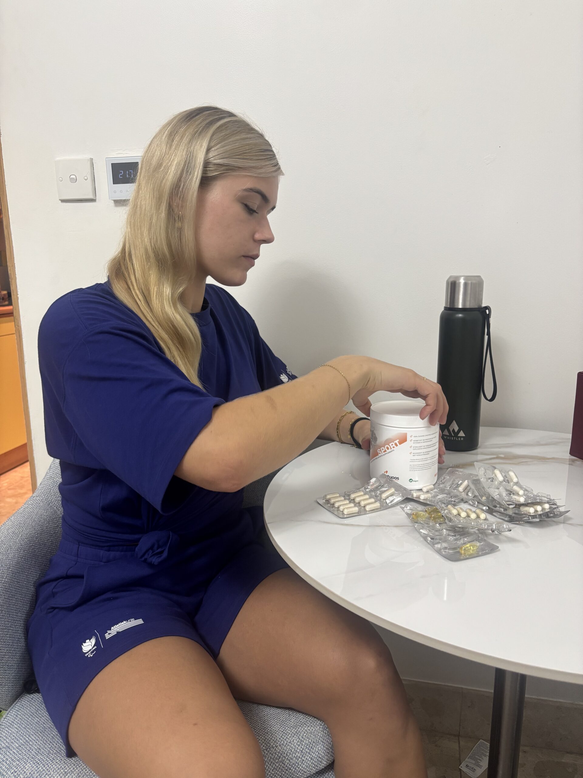 Daarna neem ik mijn supplementen, onder andere creatine, vitamine D en probiotica. Heel belangrijk om het imuunsysteem te versterken.