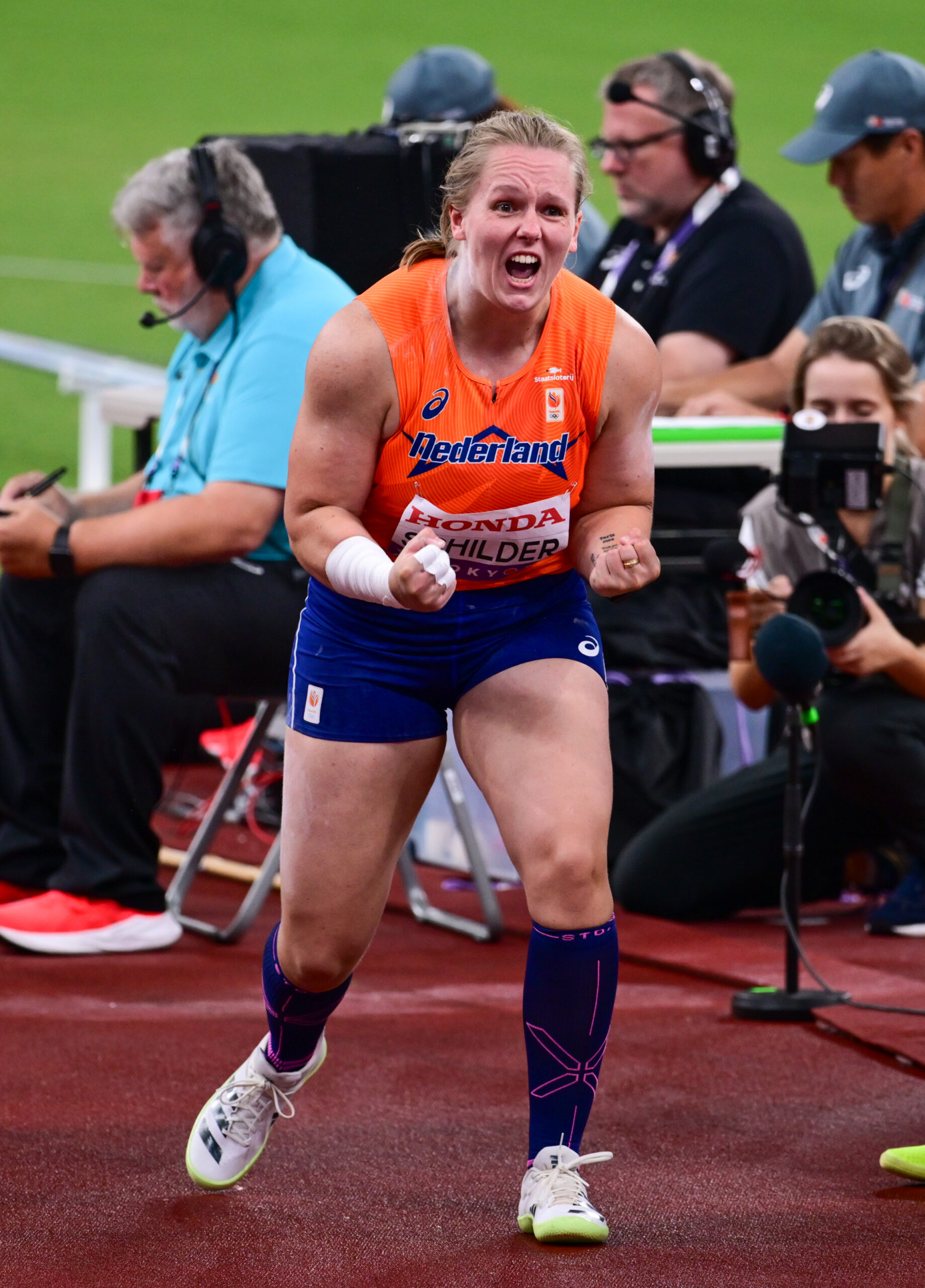Jessica Schilder (26) heeft in haar ultieme poging goud gewonnen met kogelstoten. Schilder is de eerste Nederlandse werpspecialist die op een WK Atletiek goud wint. Na een hele matige reeks van vijf pogingen was het alles of niets voor haar. ,,Ja, dit was bizar, ik er kan er mijn kop niet bij. Ik zag na poging 5 dat het allemaal dicht bij elkaar zat en bedacht ‘als ik het wil dan moet ik het nu doen’. En ik wilde het en ik deed het. En toen lukte het en daar ben ik heel blij mee. Ik liet me na die geslaagde worp van 20,29 meter helemaal gaan. Er kwam veel emotie los.”