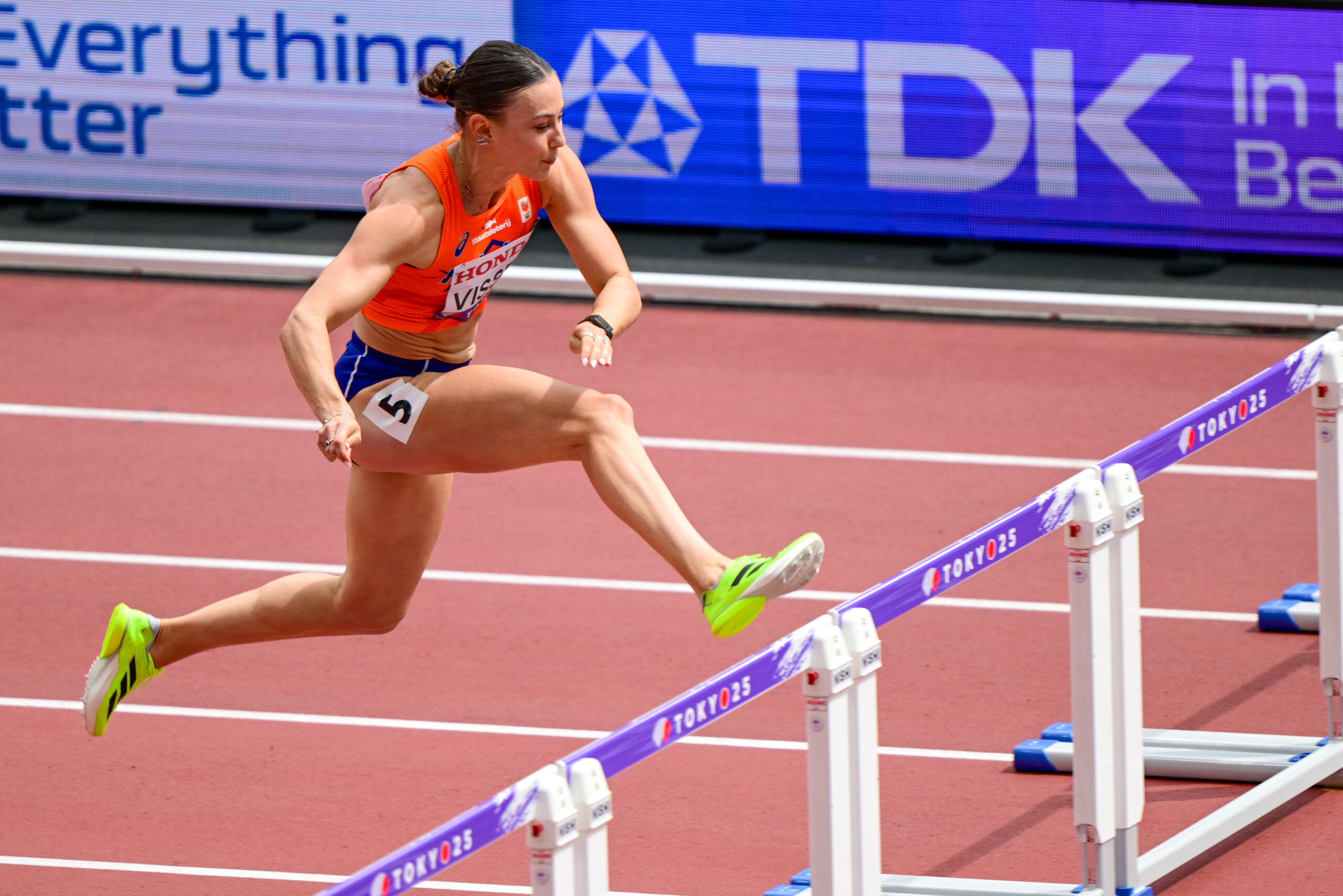 Visser behoort tot de weinige atleten uit de 53 koppige Nederlandse selectie die al tien jaar meedoet op eindtoernooien. Stond ze in 2015 nog als zevenkampster op de WK atletiek, twee jaar later onderstreepte ze haar succesvolle omscholing tot hordeloopster al met plaats zeven in de mondiale finale. De WK’s erna: zesde (2019) en twee keer geen finaleticket (2022 en 2023). ‘Het is heel fijn om met een vers Nederlands record op de WK te staan’, blikte ze op de teampresentatie eind augustus vooruit. ‘Je wil daarvoor al hard lopen, niet pas op het toernooi. Dan kun je vervolgens misschien nog wel een stapje maken.’ Visser benadrukt dat dat zowel onder Bart Bennema als onder Laurent Meuwly, de Zwitser bij wie ze sinds 2022 traint, belangrijk was/is. ‘Ik heb zo’n goeie basis, op een gegeven moment gaat het makkelijker en ga je gewoon harder.’