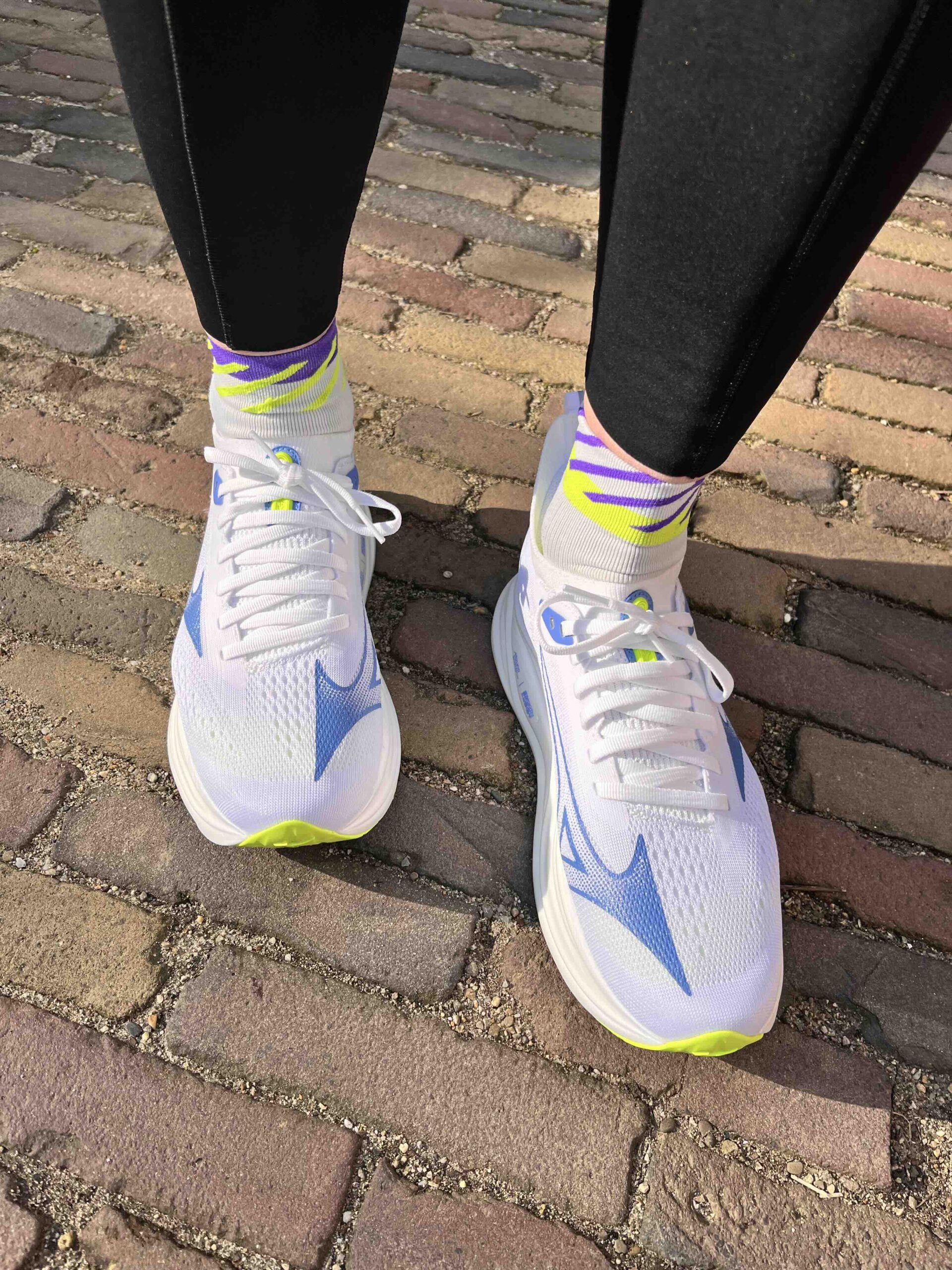 Op het eerste gezicht lijkt de Mizuno Neo Zen 2 sterk op de eerste versie. Het minimalistische design, de hoge zool en het knit bovenwerk zijn hetzelfde gebleven. Toch merk je bij het aantrekken al een verschil. Waar de eerste Neo Zen een vrij losse, sokachtige fit had die na verloop van tijd wat uitliep, voelt de nieuwe versie strakker en is hij meer ‘true to size’ (je kunt dus gewoon je eigen maat bestellen, waar zijn voorganger wat ruim viel). Dat lijkt ook een bewuste keuze van Mizuno. Het bovenwerk is opnieuw ontworpen met een combinatie van ‘mesh’ en ‘knit’, waardoor het meer structuur en ondersteuning geeft rond middenvoet en hiel. Voor lopers met smalle of gemiddelde voeten voelt dat waarschijnlijk als een verbetering. Wie juist fan was van de ruime fit van de eerste versie zal even moeten wennen.