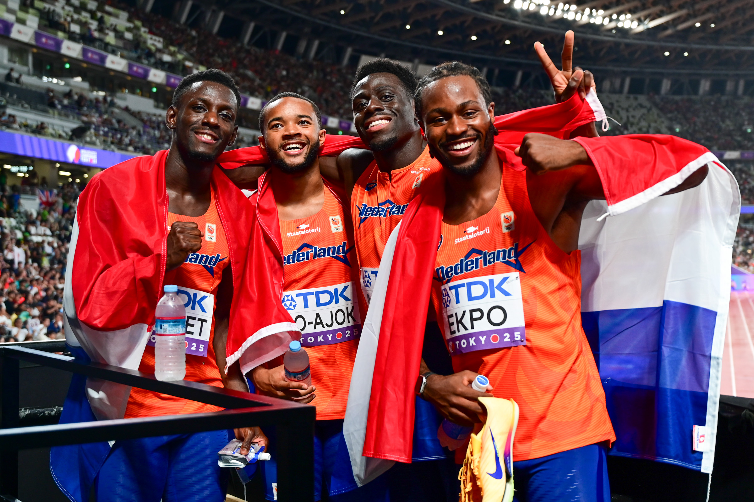 Dat het regende deerde Xavi Mo-Ajok niet. ,,Het is net of je thuis bent”, vertelt hij lachend na het winnen van de bronzen WK-plak. ,,We zijn het gewend. We lopen in Lisse met 3 meter per seconde tegenwind in de regen. We zijn zelfverzekerd. Al had het niet geregend, dan hadden we dezelfde uitslag gehad.” De startende Nsikak Ekpo denkt dat ze allemaal nog sneller kunnen worden. ,,Uiteindelijk zijn we hier ook voor de 100 en 200 meter.” Bekend waren ze nog niet voorafgaand aan de WK. ,,Ze zagen ons niet als een bedreiging. Maar wat andere mensen zeggen dat boeit helemaal niks. Uiteindelijk zijn wij hier om te presteren en hebben wij een bronzen plak. Respect moet je afdwingen en dat hebben we gedaan vandaag.” Elvis Afrifa liep al meters voor de finish te juichen. ,,Ik voelde dat we derde waren en ik kon me niet meer inhouden. Dat was leuk. Gewoon gaan gaan gaan, ik zag Noah Lyles en De Grasse voor me, finishen en daarna gewoon gek doen.” Afrifa bleek op de laatste honderd meter de allersnelste te zijn geweest (8.79). Sneller dat Lyles dus. De Amerikanen wonnen in 37.29 voor Canada met 37.55. Op wereldniveau wist Nederland met de 4×100 meter voor het laatst in 2003 een medaille te veroveren. In Parijs ontving Oranje toen met Timothy Beck, Troy Douglas, Patrick van Balkom en Caimin Douglas brons nadat een Brit uit het estafetteteam op doping was betrapt.