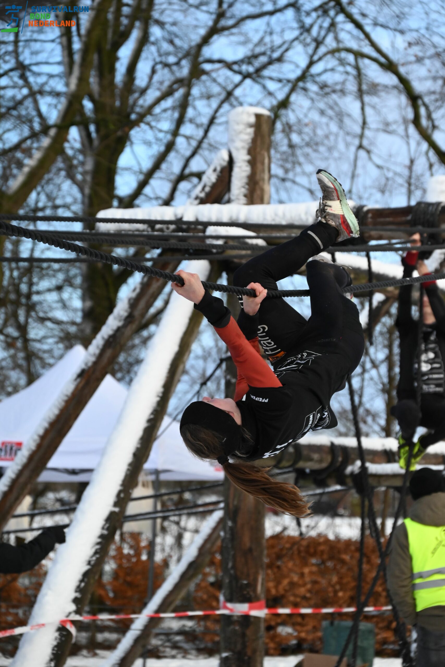 ‘Het viel me honderd punten mee. Ik had neopreen kleding aan om warm te blijven, wat ook in veel watersporten wordt gebruikt. Door het klimmen in een survivalrun worden je handen en vingers echt koud. Je moet veel harder knijpen om te blijven hangen, je verzuurt sneller, het gaat moeizamer. Ik ben na de start om 9:15 uur snel mijn eigen tempo gaan lopen. Het is leuk om je aan de heren op te trekken. Zij klimmen vaak sneller, lopen is mijn winst.’