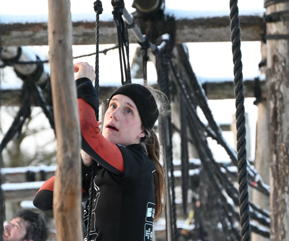 ‘Het viel me honderd punten mee. Ik had neopreen kleding aan om warm te blijven, wat ook in veel watersporten wordt gebruikt. Door het klimmen in een survivalrun worden je handen en vingers echt koud. Je moet veel harder knijpen om te blijven hangen, je verzuurt sneller, het gaat moeizamer. Ik ben na de start om 9:15 uur snel mijn eigen tempo gaan lopen. Het is leuk om je aan de heren op te trekken. Zij klimmen vaak sneller, lopen is mijn winst.’